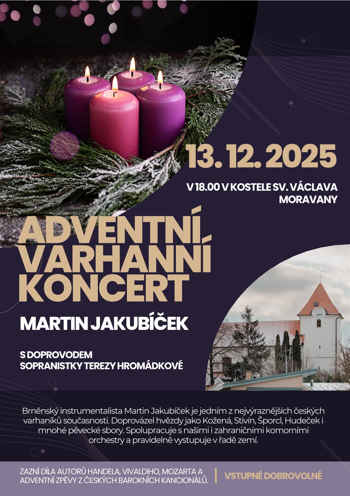 V sobotu 13. prosince vás zveme na adventní varhanní koncert do Moravan. Zahraje známý brněnský varhaník a skladatel Martin Jakubíček.